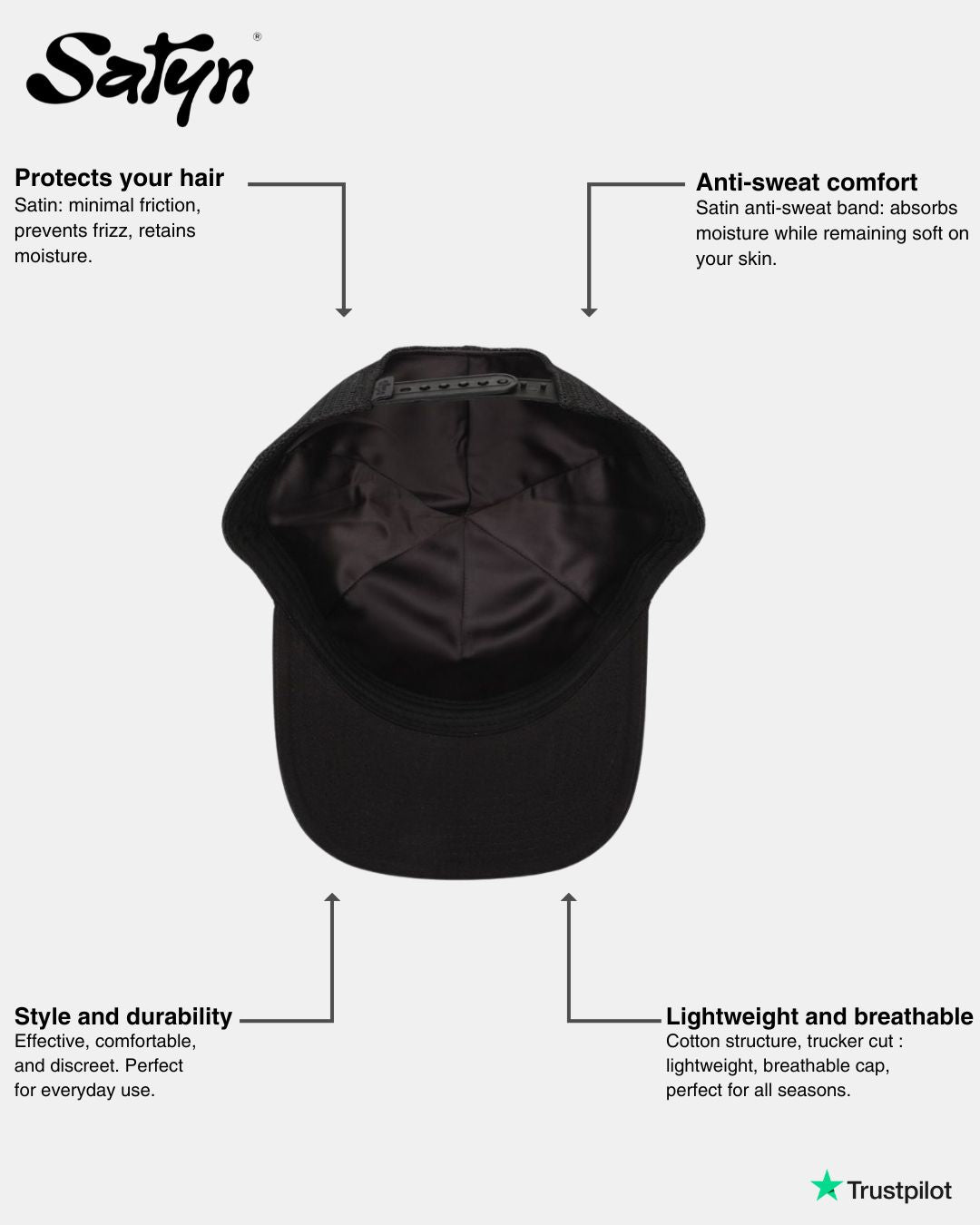 Adopt a streetwear look while taking care of your hair with our Satinn cap, designed for fashion fans who also want to preserve and care for their hair. This trendy cap and its satin interior lining keep your hair protected and frizz-free.