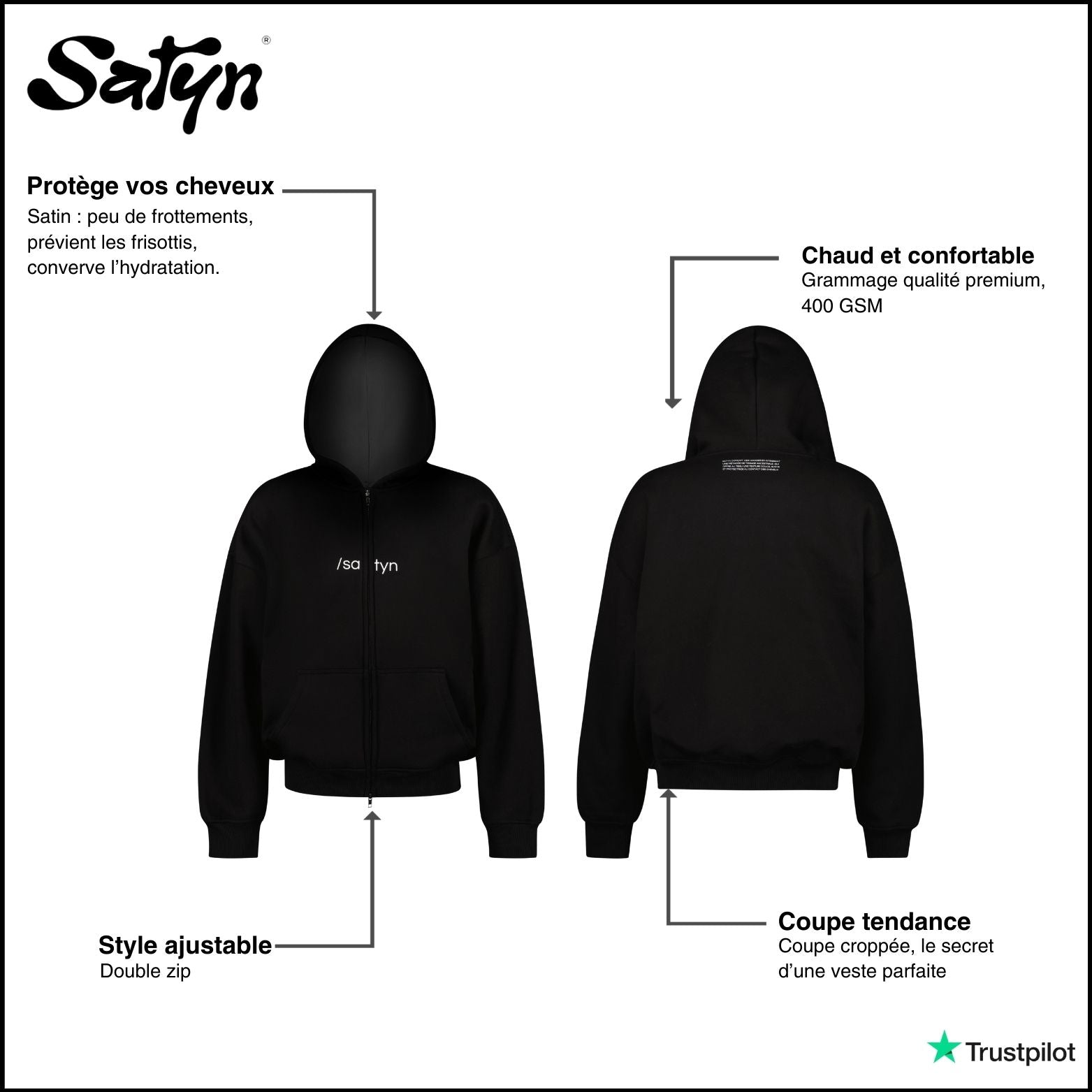 De Satinn hoodie met rits combineert comfort, stijl en haarverzorging op perfecte wijze. Dit model is ontworpen om je haar heerlijk warm te houden in de winter en het verzorgt het tegelijkertijd. De capuchon is voorzien van een satijnen voering die je haar gehydrateerd houdt en beschermt tegen pluis. Dankzij de oversized pasvorm en hoogwaardige afwerking is deze hoodie een must-have voor een moderne look en optimale bescherming.