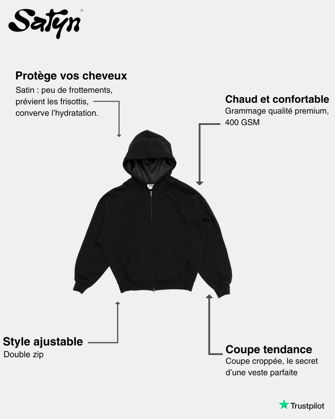 Le hoodie zippé Satyn combine à la perfection confort, style et soin capillaire. Conçu pour vous offrir une chaleur idéale pendant l’hiver tout en prenant soin de vos cheveux, il dispose d’une capuche doublée en satin qui préserve l’hydratation de vos cheveux et protège contre les frisottis. Avec sa coupe oversize et ses finitions haut de gamme, ce pull à capuche est un must-have pour un look moderne et une protection optimale.