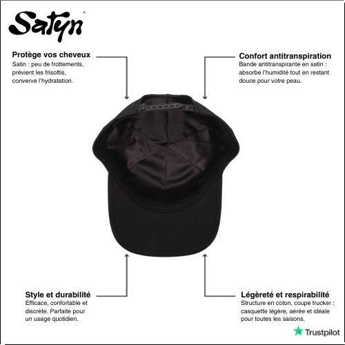 Adoptez un look streetwear tout en prenant soin de vos cheveux avec notre casquette Satyn, conçue pour les fans de mode qui veulent aussi préserver leurs cheveux et en prendre soin. Cette casquette tendance et sa doublure intérieure en satin garde vos cheveux protégés et sans frisottis.